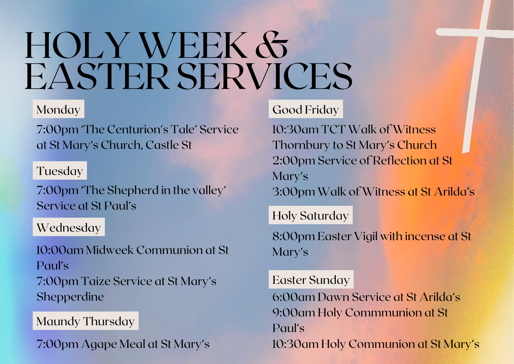 This year there are also some new twists on beloved traditions. On Palm Sunday, we will gather as a benefice at St Mary’s Church for a service that includes procession and drama — entering Holy Week with energy and imagination. And on Holy Saturday at 8pm, we celebrate the great Easter Vigil. This ancient service has long been held on Saturday evening because, in the Christian understanding, the new day begins at sunset (and not at sunrise!) As darkness falls, we wait, we watch, and we light the new fire, proclaiming Christ’s resurrection as the first light of Easter breaks into the night. Expect all the beauty we cherish — incense, bells, and glorious song — though not at dawn (unless you prefer the dawn chorus the next morning at Oldbury!)