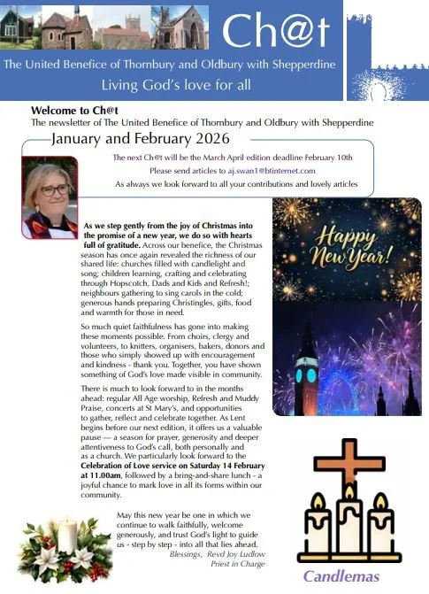As we step gently from the joy of Christmas into the promise of a new year, we do so with hearts full of gratitude. Across our benefice, the Christmas season has once again revealed the richness of our shared life: churches filled with candlelight and song; children learning, crafting and celebrating through Hopscotch, Dads and Kids and Refresh!; neighbours gathering to sing carols in the cold; generous hands preparing Christingles, gifts, food and warmth for those in need. So much quiet faithfulness has gone into making these moments possible. From choirs, clergy and volunteers, to knitters, organisers, bakers, donors and those who simply showed up with encouragement and kindness - thank you. Together, you have shown something of God’s love made visible in community. Thank you!